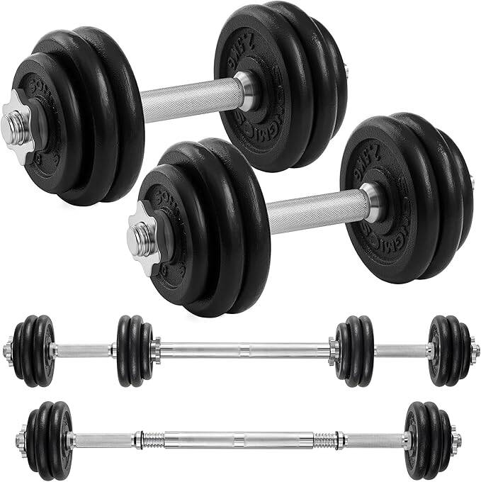 Deze set bevat variabele gietijzeren halterschijven (12 platen: 8 x 2,5 kg en 4 x 1,25 kg) waarmee je het gewicht kunt aanpassen, ideaal voor verschillende trainingsoefeningen. De halterset kan worden omgevormd tot een halter van 30 kg voor intensieve krachttraining. Gemaakt van duurzaam gietijzer met een poedercoating en gegalvaniseerde staven, is de set robuust en lang-lasting. Het extra verbindingselement van 30 cm biedt extra veelzijdigheid, terwijl de antislip handgrepen en 4-sterrensloten zorgen voor extra veiligheid en comfort tijdens je trainingen.